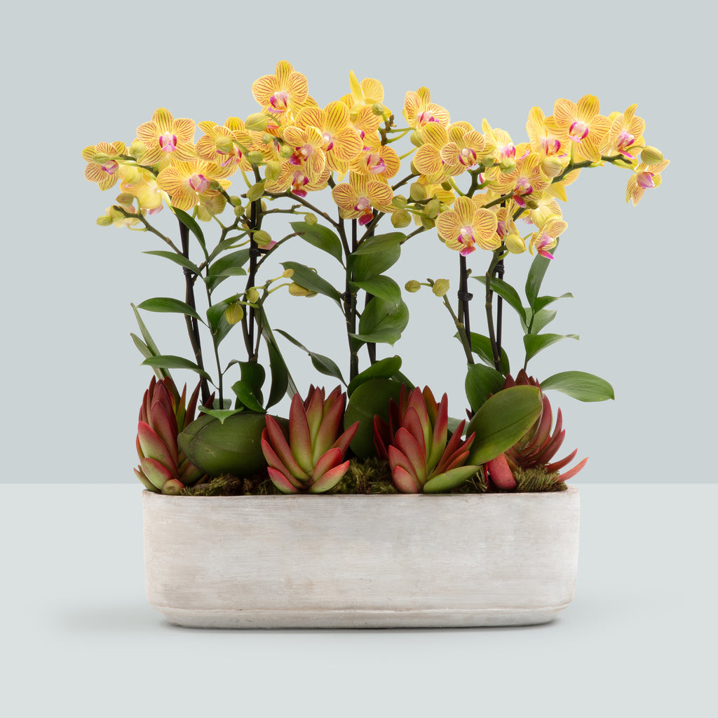 I Love Flowers BrArranjo em vaso de cimento com mini orquídeas e suculentas.