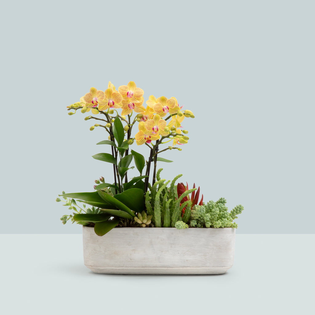 I Love Flowers BrArranjo em vaso de cimento com mini orquídeas e suculentas.