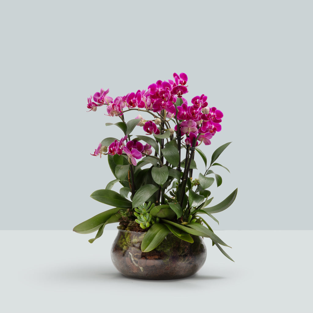 Arranjo em vaso de vidro com mini orquídeas pink.